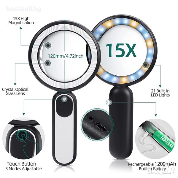 Увеличително стъкло лупа с 21 LED светлина, 15X увеличение, ръчна лупа, лупа за четене с бутон за управление и 3 режима на осветление, лупа с висока яснота за четене за възрастни хора, бижутери, занаяти, книги и други