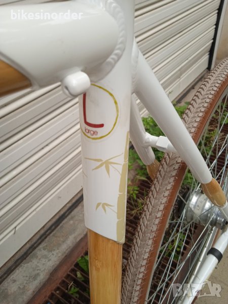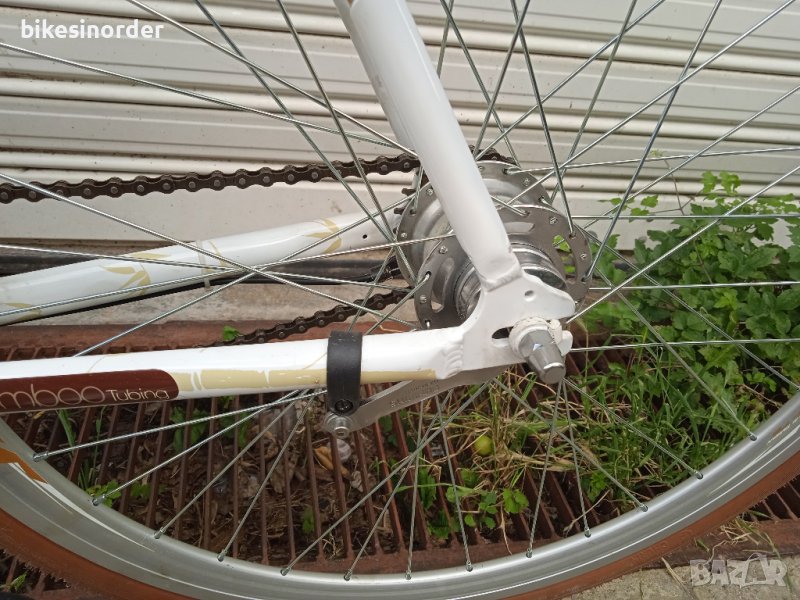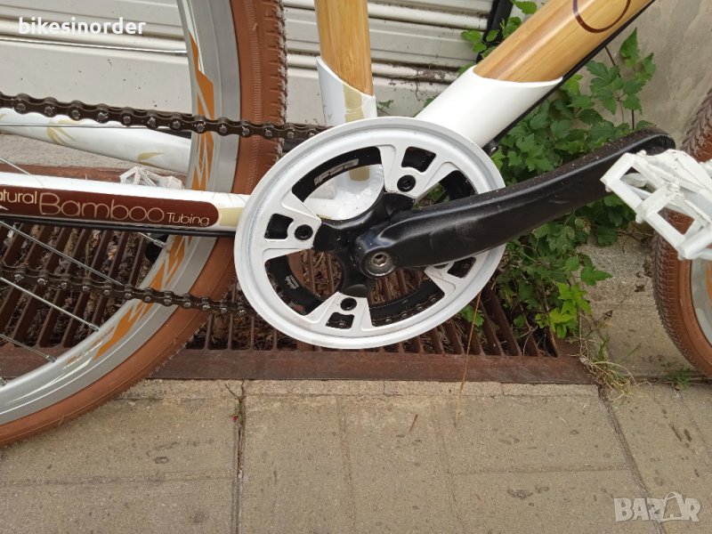 Чисто нов с 1г гаранция. Много красив бамбуковоалуминиев велосипед. Основните тръби са от филиран и пресован бамбук лек здрав и природно еластичен. Муфите са от дуралуминий (не съм специалист, но съм чувал че от тази сплав се правят самолети). Тегло на рамката 1,5кг. Тегло на цялото колело 11кг. Скорости- Shimano Nexus 7 с палцова команда и контра. Предната спирачка е Тектро. Плочата при курбелите е FSA Narrow Wide 42t. Виждал съм в Европа подобни на цена над 1000 евро.