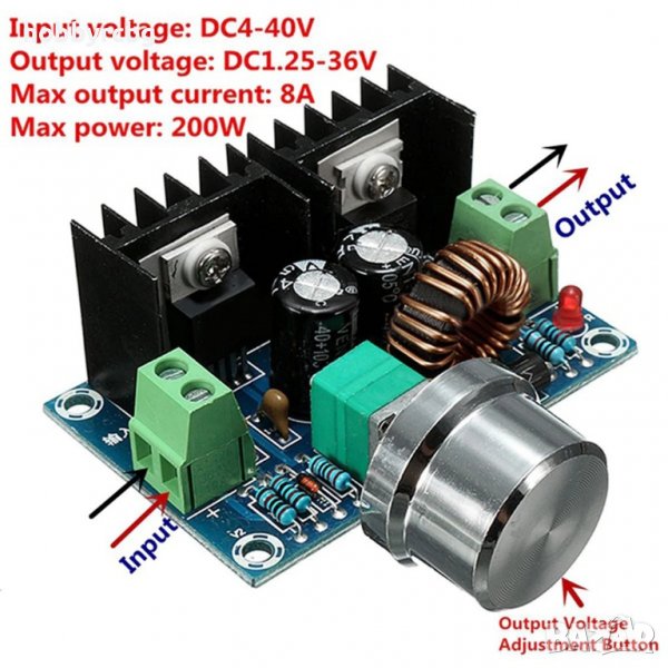 Постоянно токов регулатор на напрежение с обхват от 1.25 V до 36 V и макс. ток 8А (препоръчва се при постоянна работа с консуматор, по-голям от 5А да се използва допълнително охлаждане). Контролирайте скоростта на