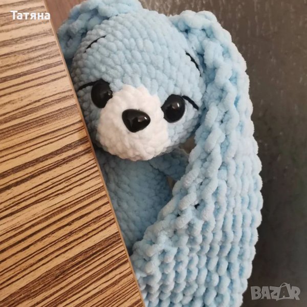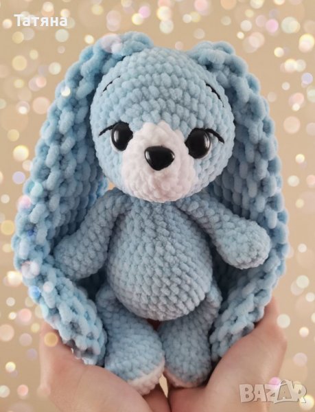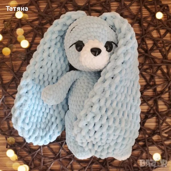 Изплетено е от плюшена прежда Wolans Bunny Baby, има очи и носле на винт, влюбен поглед и е готова за гушкане 💙 Високо е около 22 см без ушите ⭐