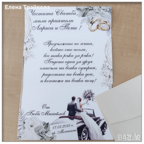 Като прекрасен завършек е поставена в бял перлен плик!