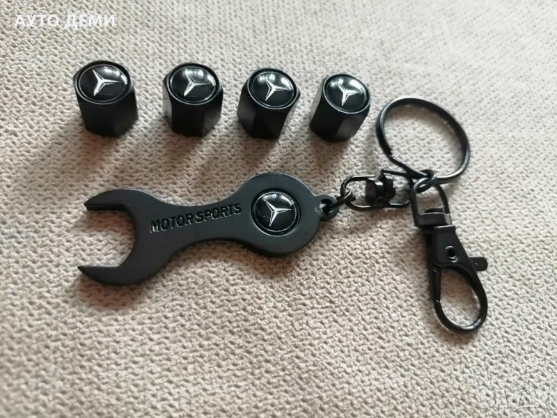 Продавам качествени неръждаеми капачки за вентили с ключодържател марка Моторспортс д емблеми на Мерцедес Бенц.