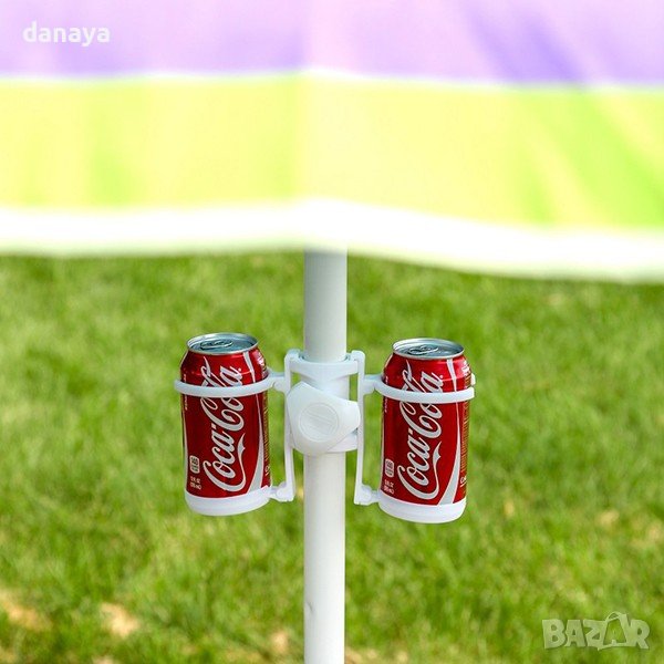 Двойна поставка за плажен чадър. Времето прекарано на плажа ще бъде още по-приятно, когато имате удобно място за чашата с кафе или безалкохолното. Тази удобна поставка е предназначена специално за плажния чадър и е за 2 бр. чаши, кенчета или бутилки. Лесно се монтира на дръжката на чадъра и благодарение на нея напитките ви ще са на сянка, далеч от пясъка.