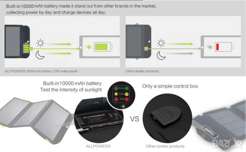 "ALLPOWERS" е най-успешната и утвърдена азиатска иновативна, и висококачествена марка за соларни панели и батерии, с представителства в Германия и Франция. Всички спецификации и функции са реални, а не както при евтините аналози, които не вършат полезна работа или просто не са достатъчно ефективни!
