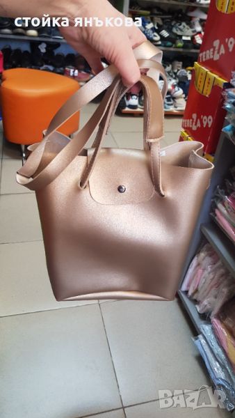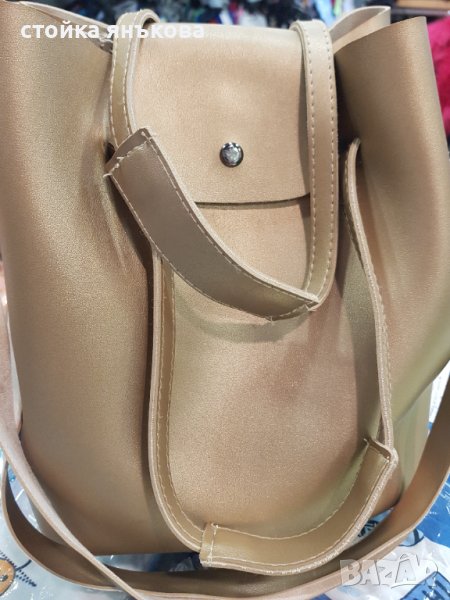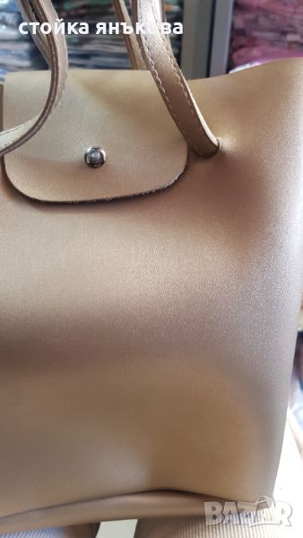 Продавам златиста дамска чанта, удобна и практична, има дълга и къса дръжка. Дължина 30 см, ширина 21, дьлбочина разтегната 16 см