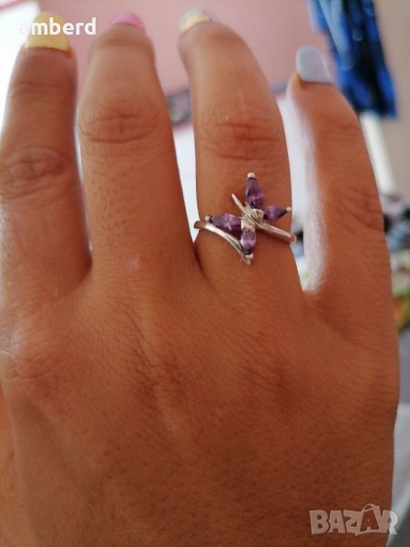 Нежен и елегантен пръстен, изработен от сребро проба 925 и 4 лилави циркони. Вътрешен диаметър 16.8мм.