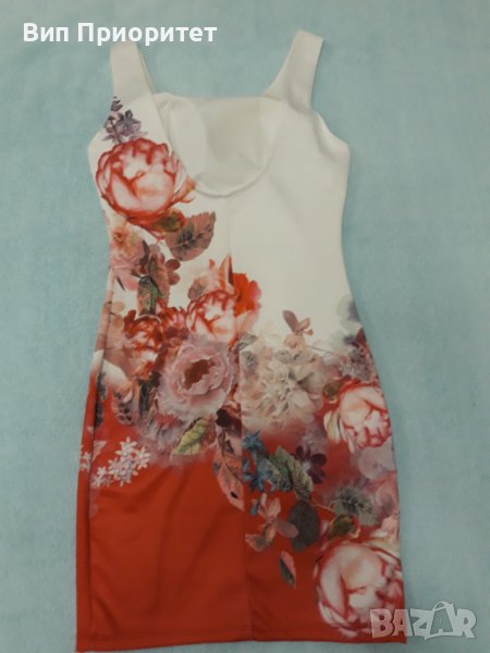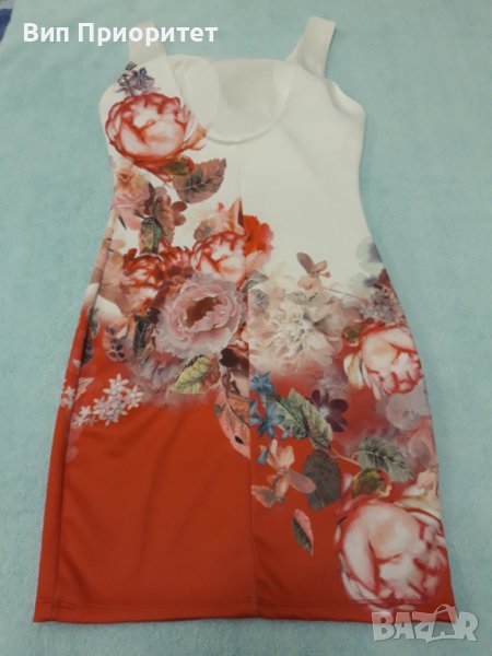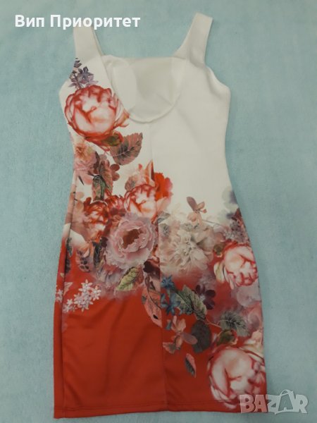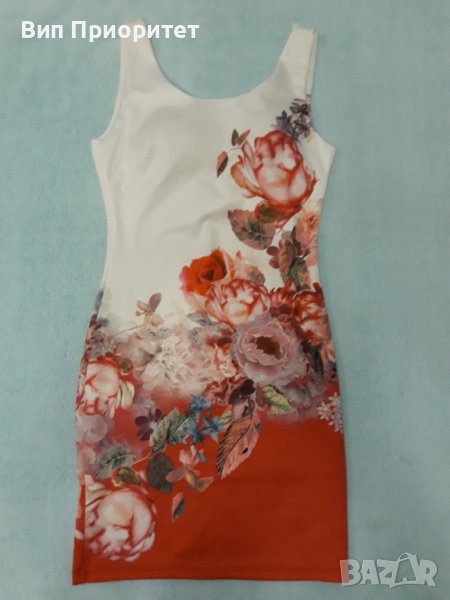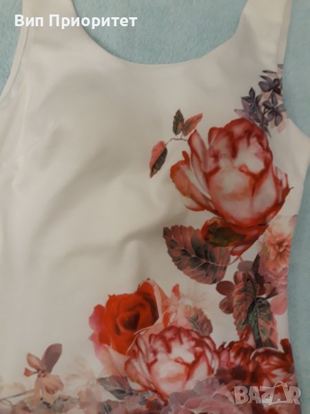 Красива рокля , еластан и трико , бяла във високата част и червена в долната част с принт от рози диагонална граница. Луксозна, еластична , Вградени подплънки на бюста.