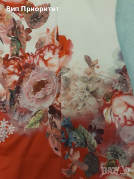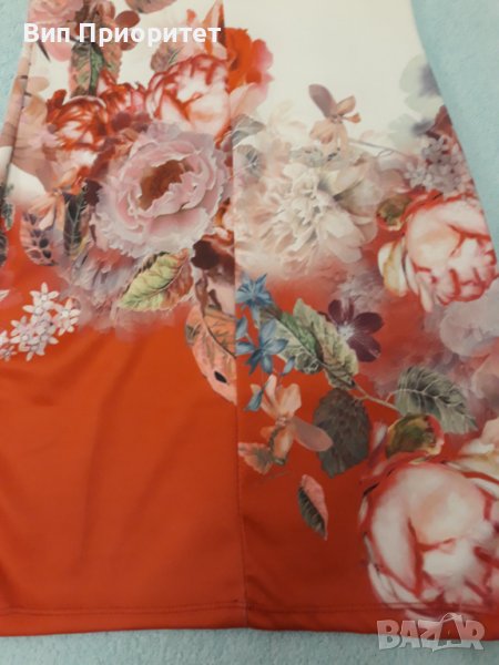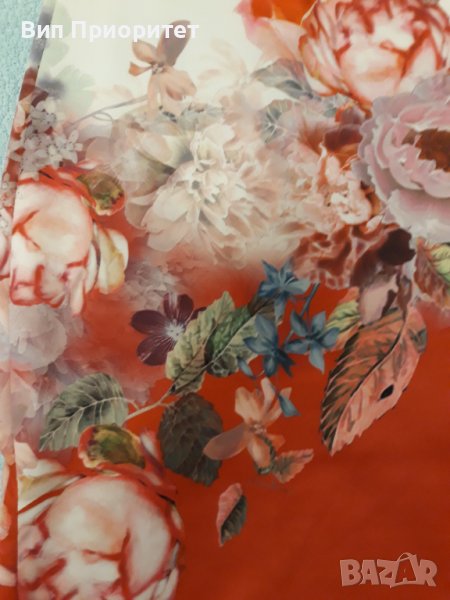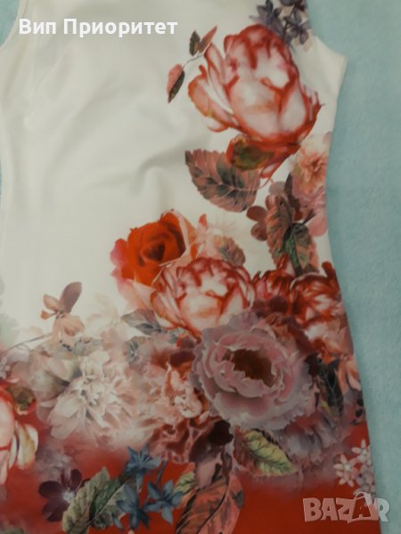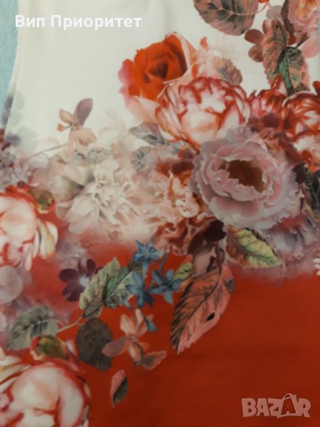 Луксозна рокля- бяла във високата част и червена в долната част с принт от рози диагонална граница → Обява 37259269