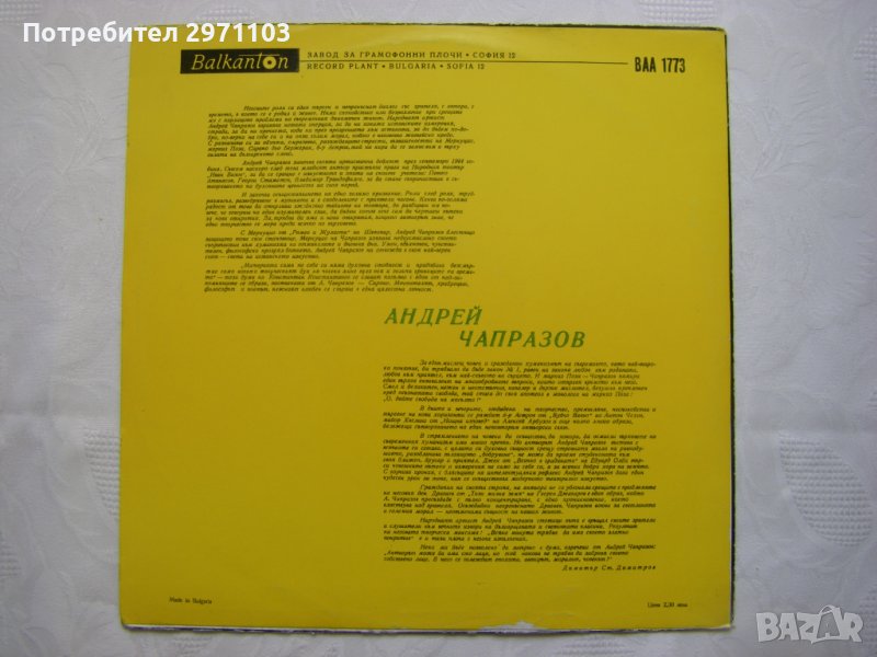 Народният артист Андрей Чапразов стотици пъти е връщал своите зрители и слушатели към вечните извори на българщината и световната класика. Резултат на неговата творческа максима: "Всяка минута трябва да има своето златно покрытие" е и тази плоча с негови изпълнения.