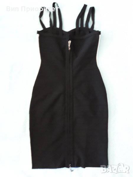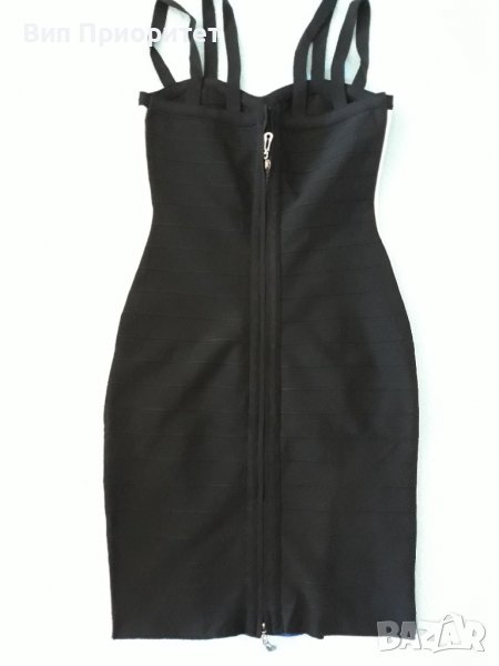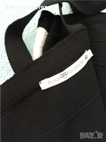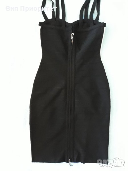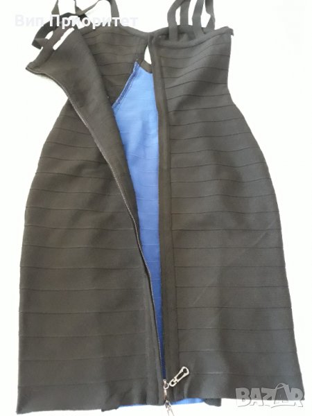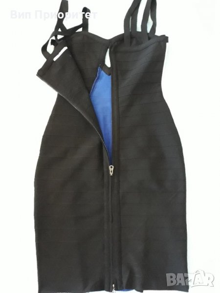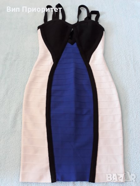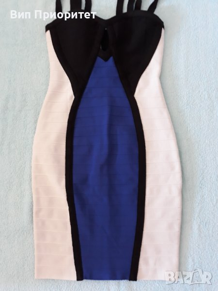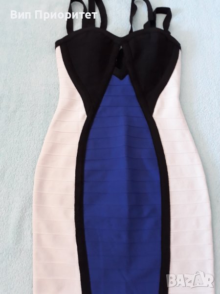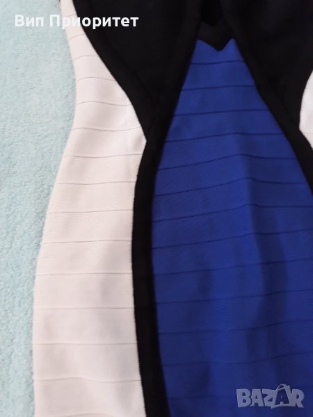 Синьо, бяло и черно - изключително красива и стилна ластична еластична рокля, елегантна , нова , на гърба с впечатляващ цип от горе до долу, скъпа , стегната материя, маркова- Бляк Дайманд..