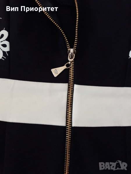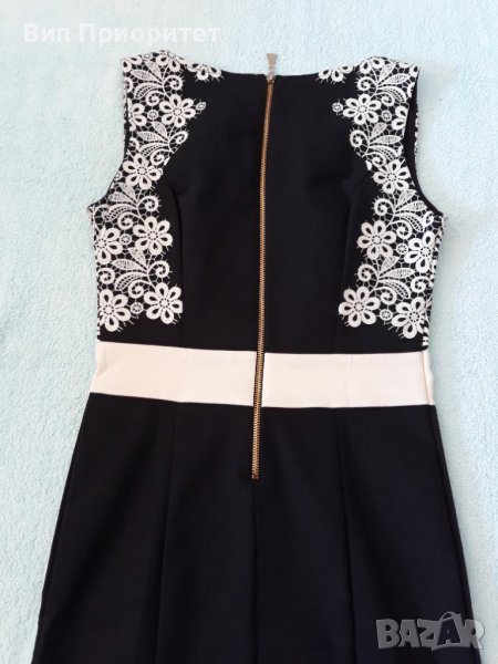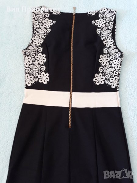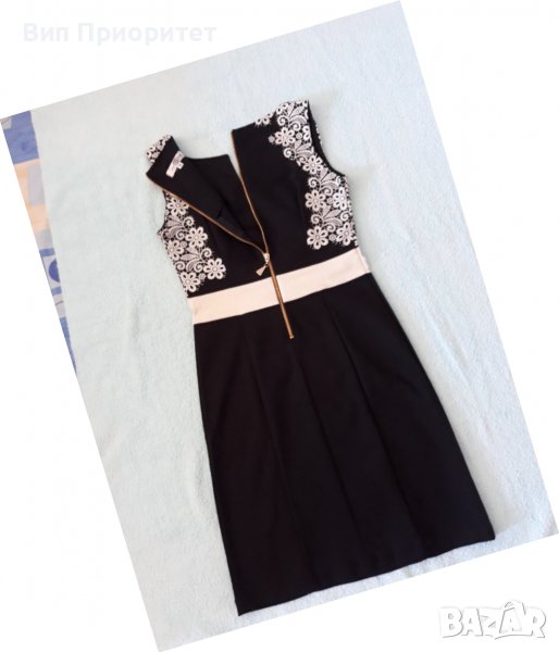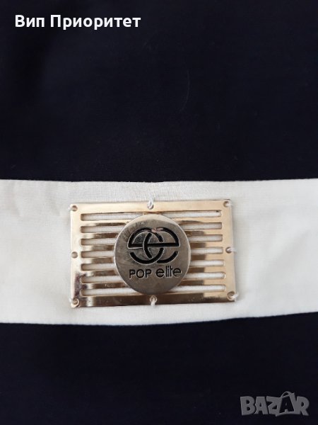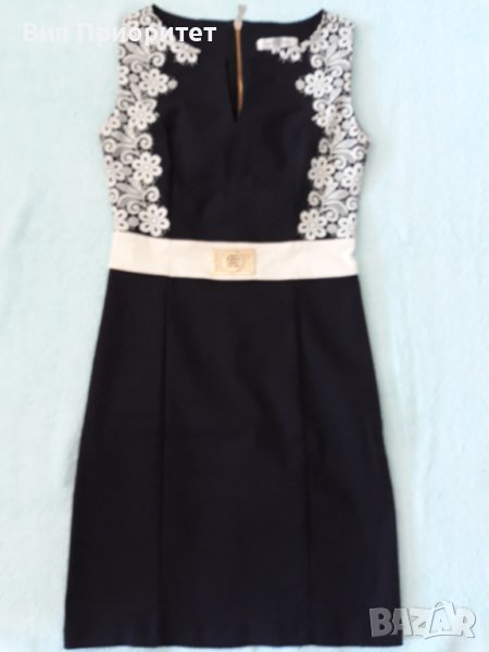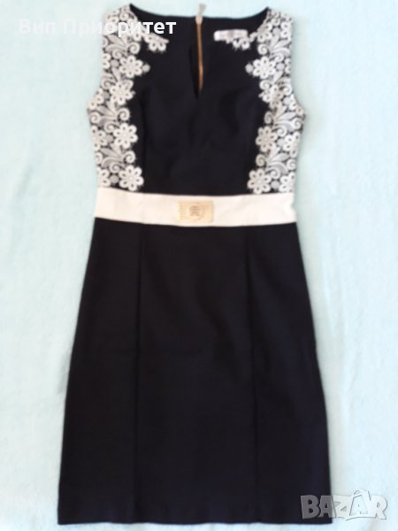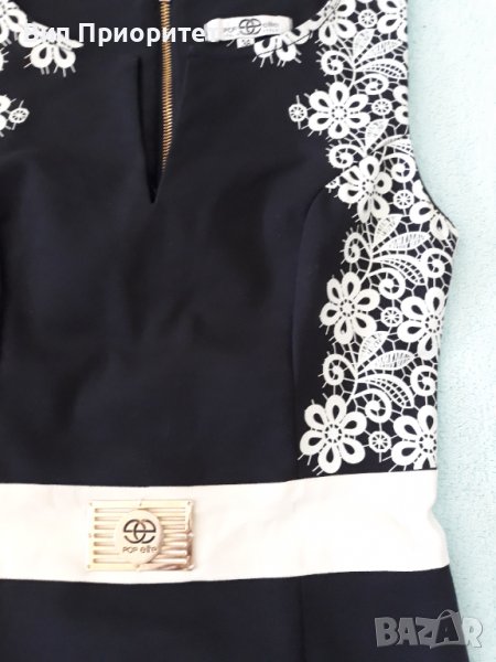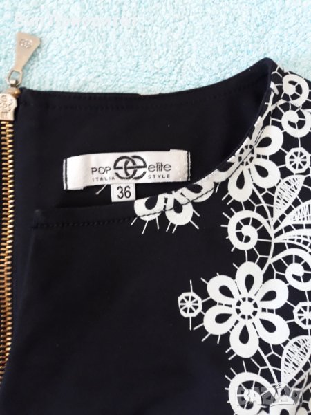 Италианска маркова рокля POP ELITE , елегантна , бизнес стил, тъмно синя- цветът на истината - с бял рязан мотив и златни аксесоари, еластична материя, скъпа, италианско много високо качество , с цип на гърба.