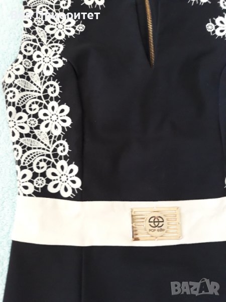 Италианска маркова рокля POP ELITE , елегантна, бизнес стил, с бял рязан мотив и златни аксесоари → Обява 37264855