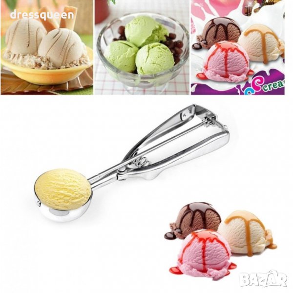 Лъжица с пружинен механизъм който позволява с едно движение да напражите перфектната топка сладолед,дори млечна или руска салата!