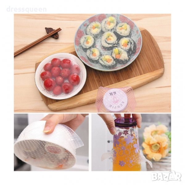 Силиконовите капаци са подходящи за употреба в микровълнова фурна, хладилник и фризер. С тяхна помощ, без проблем можете да съхранявате вече нарязани пресни плодове и зеленчуци, супи, други сготвени ястия, сладкиши, салати, ядки, топли и студени напитки. Може да покривате отворени опаковки на хранителни продукти – кутии, буркани, консерви. При всички случаи храната или напитките ще останат свежи за по-дълго време, като това няма да повлияе на вкуса им.