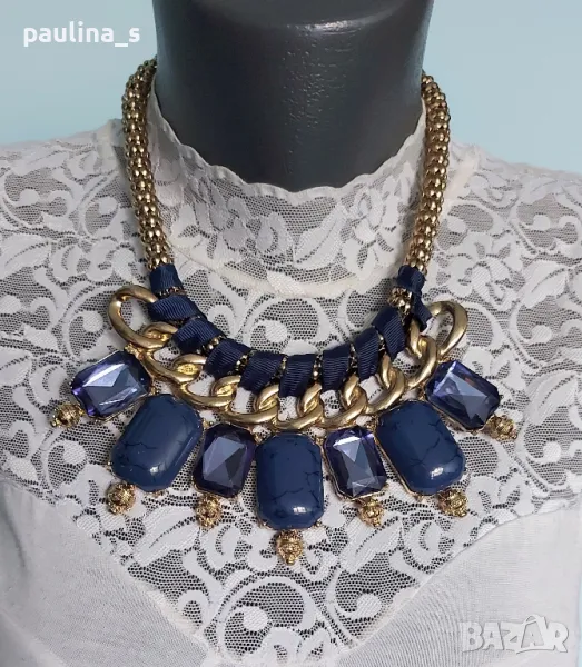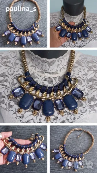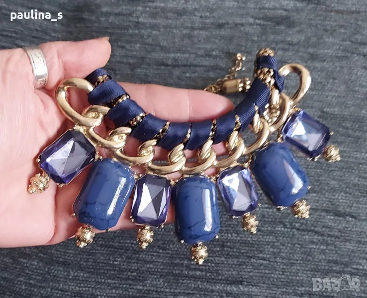1. Колие тип чокър с кобалтово сини камъни и текстил. Металните елементи са са в златисто, има и удължител, универсален размер. 39,99лв