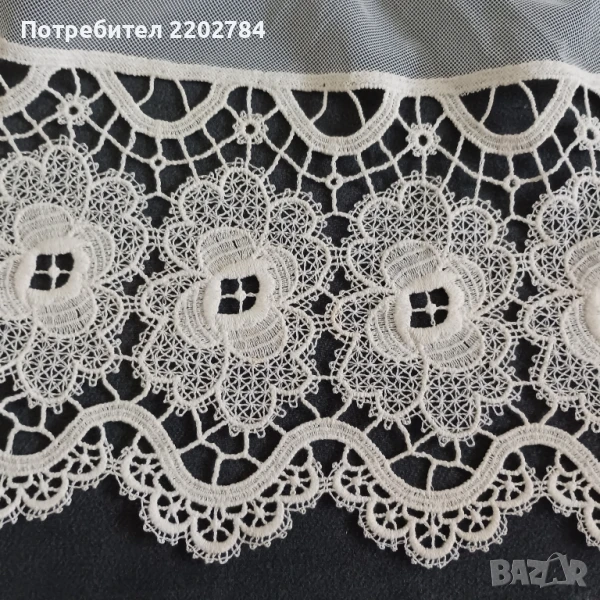 Размери на едното - ширина 200см, дължина по средата 82см, дължина в краищата 120см.Ширина на дантелата 20см.