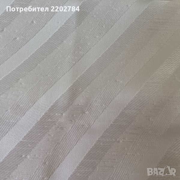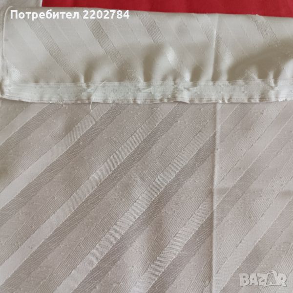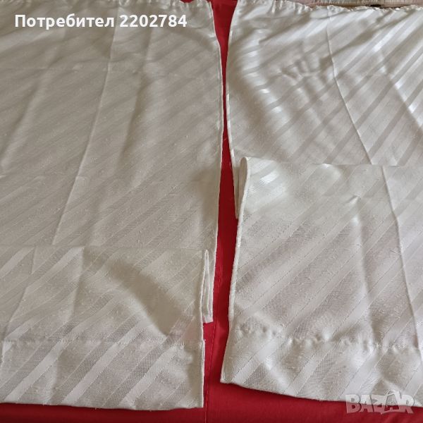 Четвърти са комплект от два броя пердета бели,плътни и са малки.Десена е на глатки ленти и на ленти с малки топчета като букле.С перделик.При интерес давам размери.
