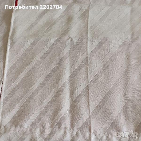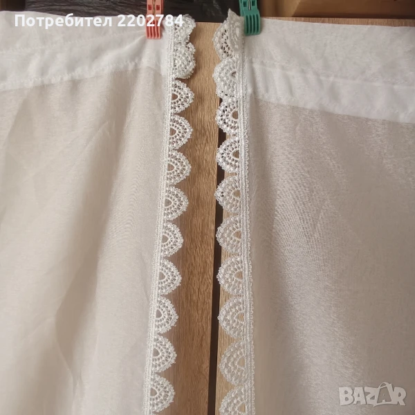 Последен е комплект от два броя в цвят слонова кост с прекрасна дантела.Нови,неизползвани.Пердетата са във форма на дъга - в средата са по къси,а по дълги в краищата.Без забележки.Имат в горната част подгъв от 3см за нанизване,но при нужда могат да се пришият копчета за обикновен корниз.