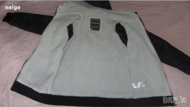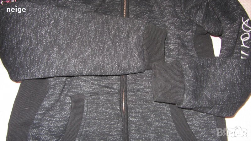 Цветът е черен, меланж. Отвътре е с бяла рошава подплата, на ръкавите е хастар. Два джоба отпред. Ципът е с предпазител под брадичката. Висока яка. Текстилен ластик в талията и на маншетите.От същия ластик са лентите на джобовете и под ръкавите странично. Надписът на ръкава е бродиран, а емблемата е шита и бродирана.А