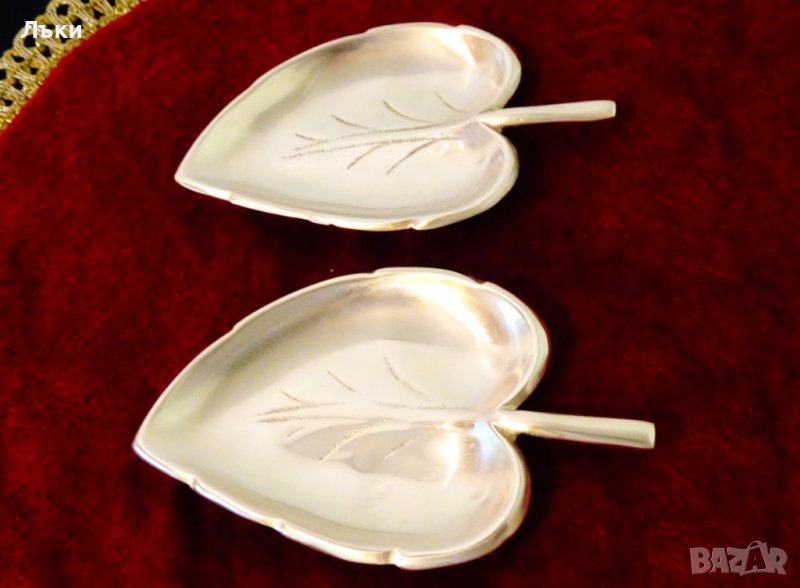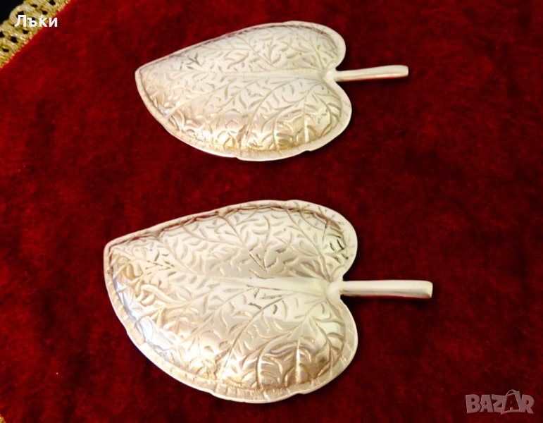 масивен златен бронз с ефектна форма на листо.Дължина 12.5 см.,ширина 7.5 см.,височина 1 см.,тегло на всяка 90 гр.Налични 2 броя,цена 12 лв.,за брой.