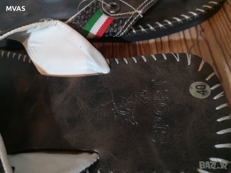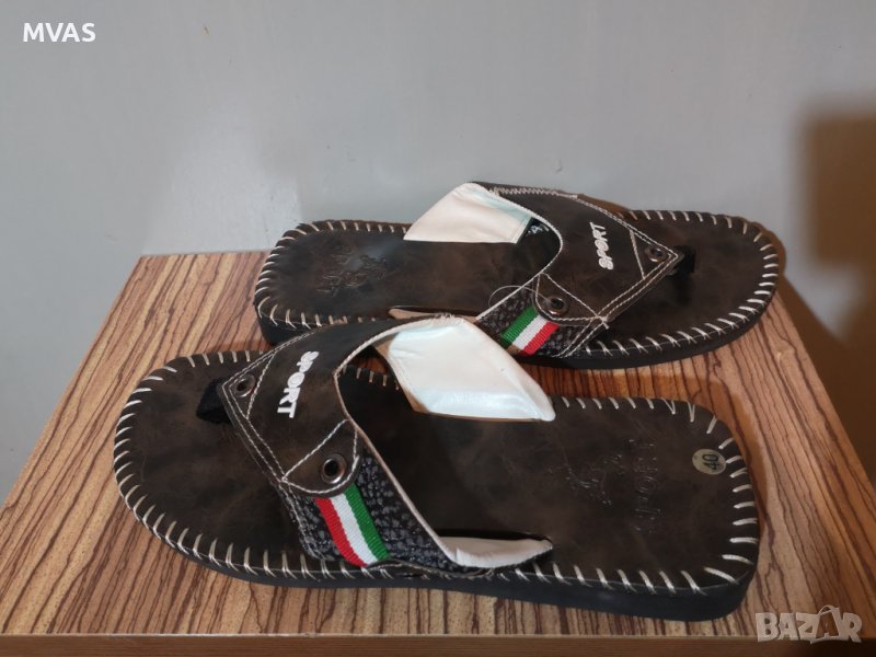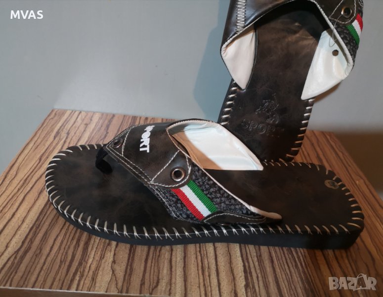 Нови мъжки чехли 40-43 размер. Тъмно кафява еко кожа, през пръст като джапанки открити, с българското знаме. От долу са релефни да не се хлъзгат, черна гумена подметка