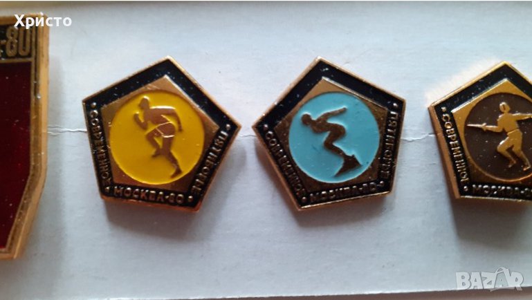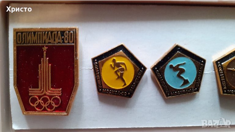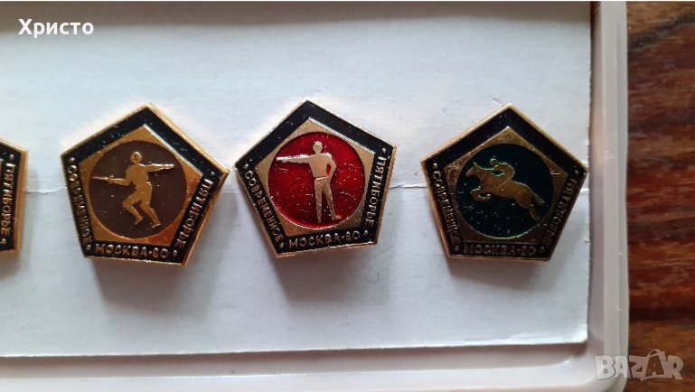Продавам значки антикварни СССР, Олимпиада Москва 1980 година, чисто нови, не са докосвани, в оригинална пластмасова кутия с размер 15,5х7х1,5 см, 6 броя значки: олимпиадата и Петобой. Уникална рядкост, цена за комплекта - 57 евро. Имам 2 комплекта, при закупуване на двата обща цена 98 евро.