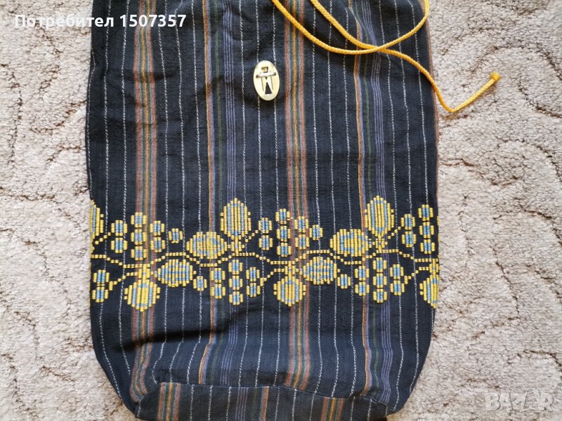 Раницата е ръчна изработка. Шита е от битова престилка с ръчна бродерия.