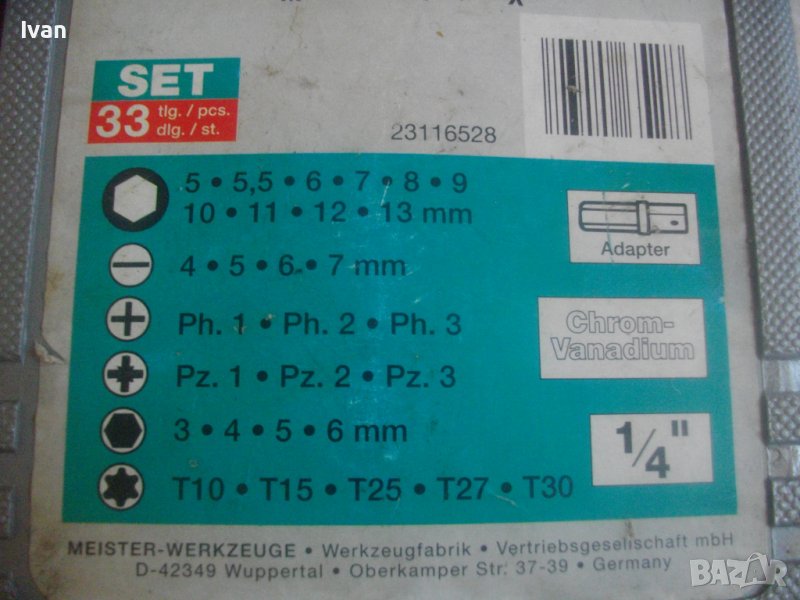 Всички компоненти са от хром-ванадиум. Общо 10 камъка торсове и 20 бр. битове.