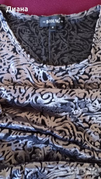 Прекрасна еластична рокля от сребристосиво релефно кадифе на деликатен черен фон, къс ръкав, изчистена елегантна кройка. Материята е приятна и мека.