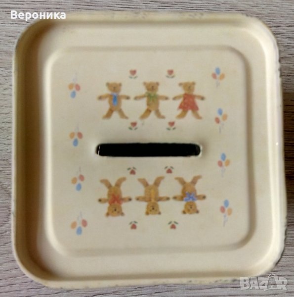 Симпатична метална касичка от бонбони от Англия с капаче отдолу с мотив мечета. Размери 8 х 8 см. Следи от употреба по долната част (капачето).
