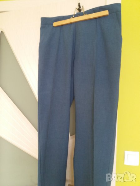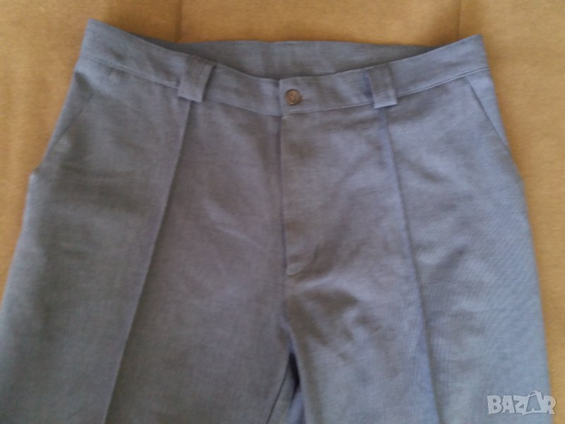 Мъжки летен панталон цвят син, с 2 странични джоба, закопчаване с цип. Панталона е нов, само е пробван. Размер Л, или талия 44 см отпред измерено /обиколка 88 см/, ханш 56 см /или 112 см/, дължина 106-107 см /може да се подгъва по желание/. Отговарям на съобщения тук, изпращам с суриер с отстъпка, преглед и тест, или лично предаване в София.