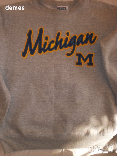 Блузонът е сив с апликиран надпис MICHIGAN на гърдите, много приятен.