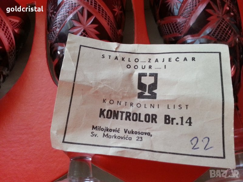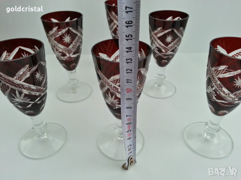 Кристални чаши цветен червен кристал ръчно гравирани в кутия 690лв без кутия 6 бр -590лв гарафа 140лв сервиз комплект сет лот ретро арт декор винтидж колекция стари антикварни предмети обзавеждане за дома и семейството подходящи за подарък за ценители и колекционери