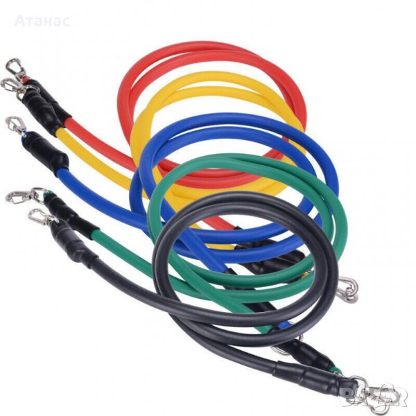 Фитнес ластици за трениране включват: 5 бр. Фитнес ластици за трениране : жълт (10 lbs) 4.5кг, червен (15 lbs) 6.75кг, син (20 lbs) 9.0кг, зелен (25 lbs) 11.25кг, черен (30 lbs) 13.5кг, 2 бр. удобни дръжки 2 бр. каишки за глезена 1 бр. Котва за 1 врата 1 бр. чанта