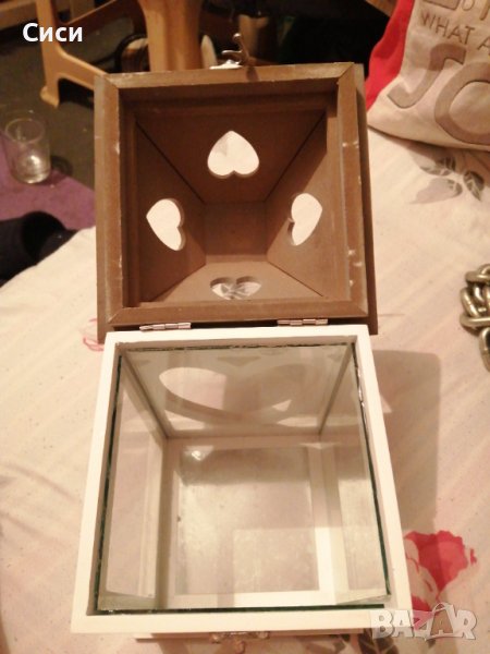 С две чашки стъклени. Размер основа 14/14 см. Кутия 12.5/12.5 см Височина на кутията отворена 15 см. При затворен капак 16.3 см. Периферия на капака 14/14 см. От върха на кутията обща височина 28.5 см.