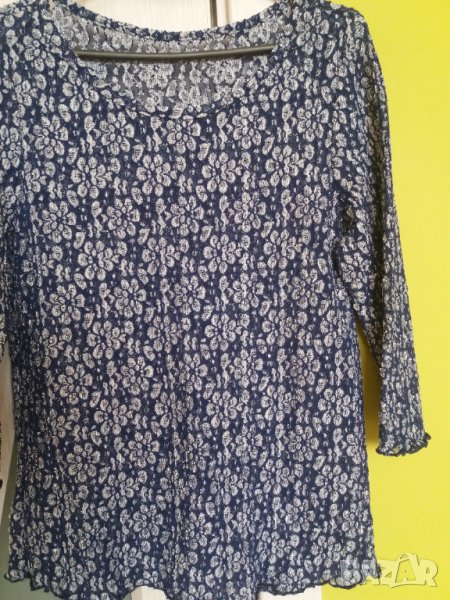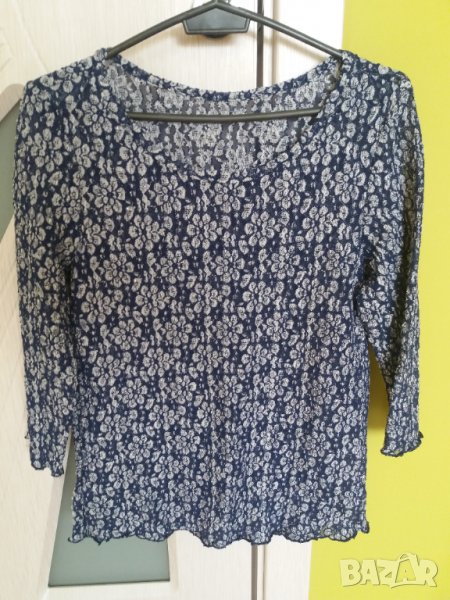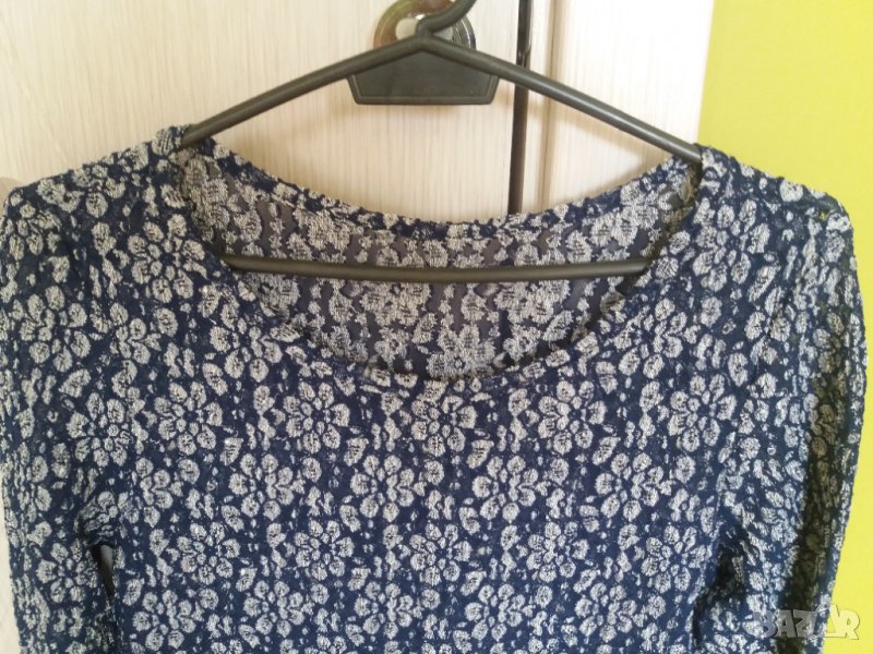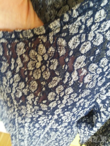 Дамска дантелена блуза цвят тъмносиньо в комбинация с бели цветчета. Размер М, рамене 38 см, бюст отпред 46 см /или 92 см обиколка/, дължина 60 см, ръкав три четвърти - около 43-44 см. Материята е разтеглива и еластична. Блузата е нова, необличана и много елегантна. Отговарям на съобщения тук, изпращам с куриер с отстъпка, преглед и тест, или лично предаване в София.