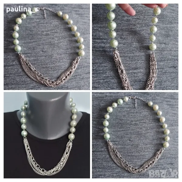 2️⃣ . Колаж / Цената е крайна, без пазарлъци 10 евро. Много красиво колие със зелени перли и синджири, с удължител, слагано е за кастинг веднъж, като ново. Подходящо за повод или подарък.