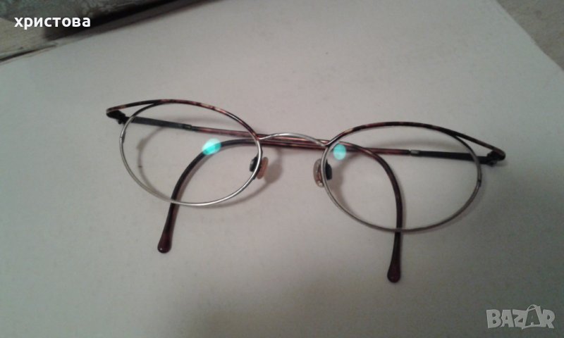 Рамката на очилата е мн. лека,нежна и актуална за всеки повод.Десена е в светло и тъмно кафяво ,съчетано със златисто.Лупите са +2,50 и са слагани в лицензирана оптика..Продават се без кутията.
