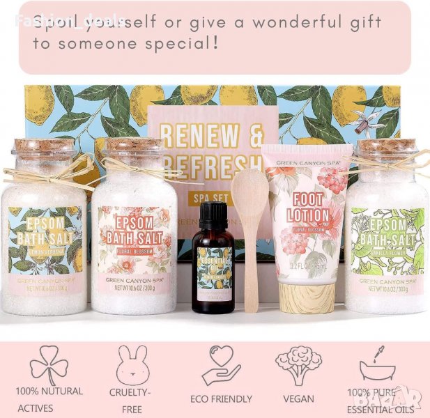Включва: 100% натурална и най-чиста сол в 3 различни и завладяващи аромата - лимон, ванилия и флорален цвят; лосион за крака и чисто етерично масло