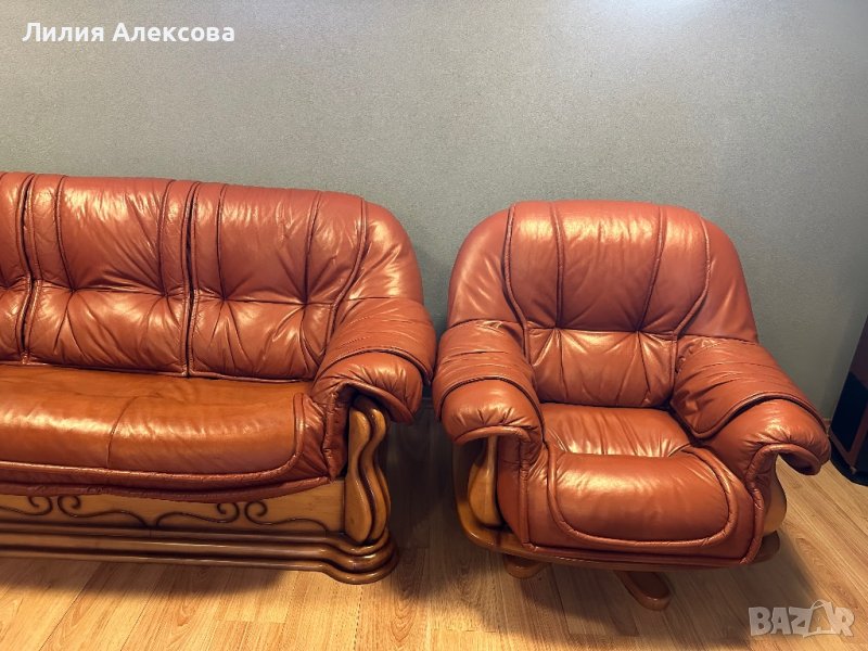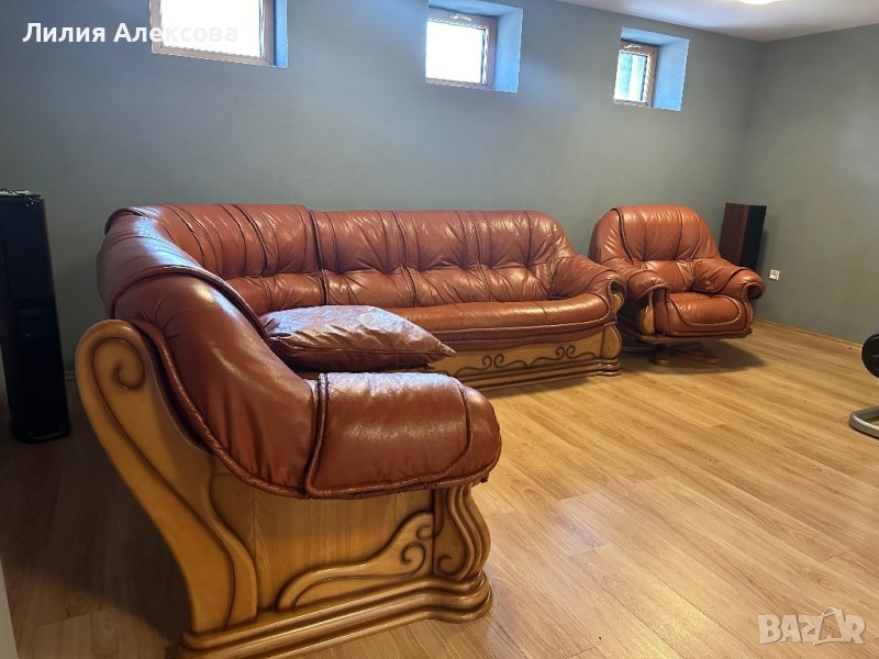 Гарнитурата е от естествена кожа и маивно дърво дъб .Закупена от мебелна къща Пластика.Запазена и подържана грижливо.Комплекта включва : диван, който се състои от двойка,ъгъл и тройка, 300/250см.габаритно ,и въртящ се фотьойл