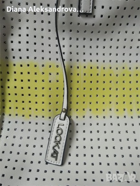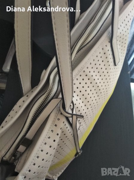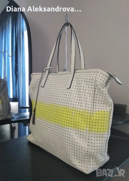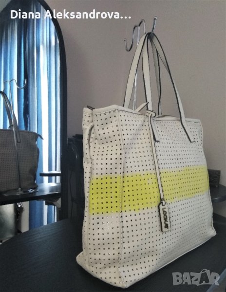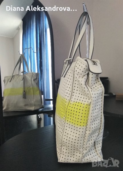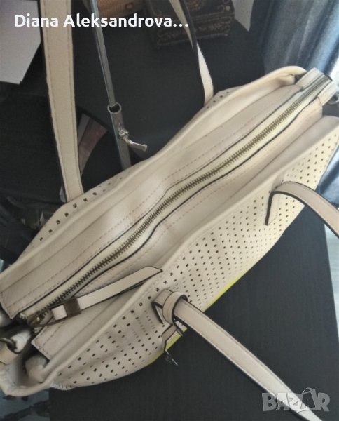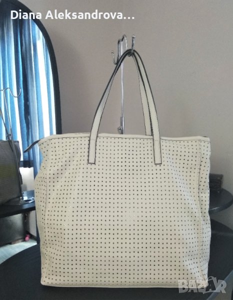 Голяма дамска чанта, тип торба. Изработена от изключително мека и лека еко кожа, в нежен бежов цвят. Цялата кожа е перфорирана на квадратчета, а под нея има лъскава подплата. Вътре е едно основно отделение, в което има джобче за аксесоари. Има допълнителна дълга дръжка.