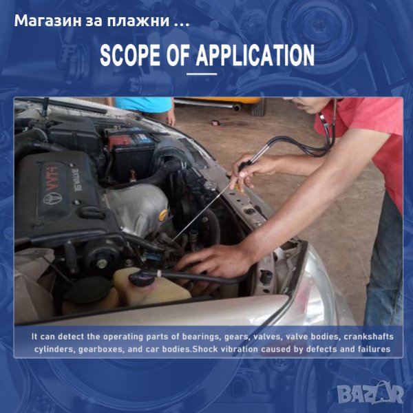 Със стетоскопът на бързо откривате източника на шум на двигателя, като: бутала, износени зъбни колела и лагери, повредени клапани, отказ на водна помпа, издухани уплътнения. Също така е полезно при проследяване на шумове от таблото. Има пластмасови уши и 300 мм. сонда със звукова камера.