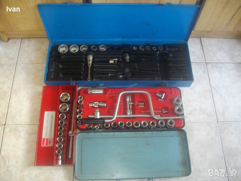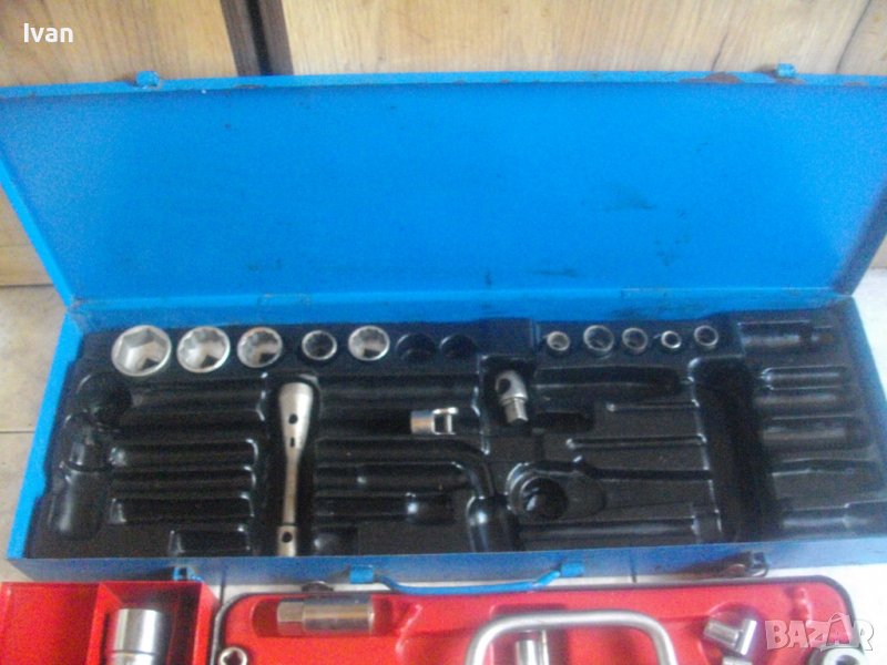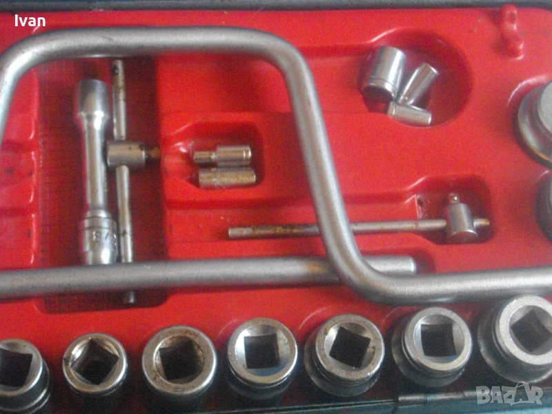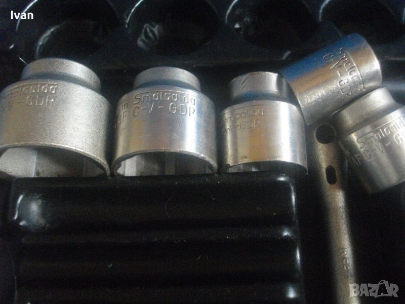 ОПИСАНИЕ на голяма синя - син куфар. Производство оригинално от преди години висок клас качество ГДР /Германска Демократична Република/. Ретро инструменталиум. комплекта не е пълен - останали са 10 камъни торсове размери от 10 мм до 36 мм, 1 бр дълъг ключ, 2 адаптера накрайници. Всички имат лого Smalgalda Cr-V GDR. Куфара е голям, масивен, метален изцяло със снемаща се метална дръжка и метални копчалки в пълан изправност. Раземри на куфара - 21 см широчина, 65 см дължина, височина/дълбочина - 7 см. Вътре е с ПВЦ вложка за компонентите, която може да се извади. Тегло на гедорията/гедоре - ГДР - 4,0 кг.