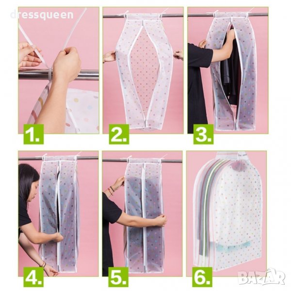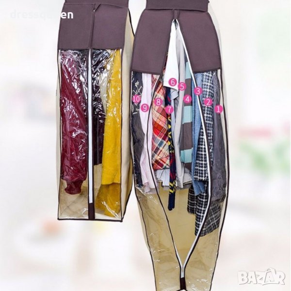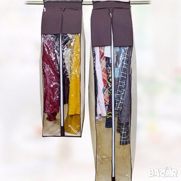 Калъфите се предлагат в два размера - S 90x60x30см (подходящ за съхранение на сака, ризи, блузи, панталони и други по-къси дрехи) и L 120x6030см (подходящ за съхранение на рокли и палта).