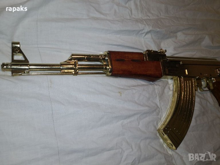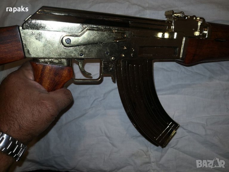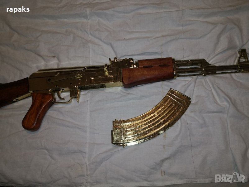 Нестрелящарепликана най - разпознаваемият, разпространеният и внушителен автомат в света. АК 47 - Калашников. Продава се без коженият ремък, той при желание се доплаща 40 лв. Автомата е в златист цвят на металните части . Подходящ е за подарък, както и за икраса.