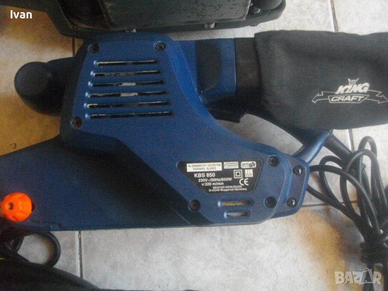 ОПИСАНИЕ на тъмно син 850 вата Кинг Крафт с торба за прах. Почти нов, съвсем малко ползван голям 850 ватов лентов шлейф, професионален немски модел на Кинг Крафт. Марка и модел - King Craft KBS 850. Произовдство - оригинално Германия - 2003 г- GERMANY - упоменато на маркировките. Машина е с много запазен външен вид, като нова, в отлично техн. сътояние. Работи много добре - няма абсолътно никакво искрене от ниво четки/ротор, няма никакви вътрешни шшумове като виене, тракане, луфтове. Гумирано покритие на заден амортисьор. Размер ползвани шкурокови ленти/пояси - 75х533мм. Конектор отпадъчен прах. Налична е оригиналата платнена торба за прах с фабричното лого и цип. Автостоп на спусъка. Равна горна повърхност за обърнат стоеж при работа.
