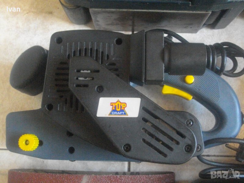 Почти нов, трудно различим от нов голям, масивен лентов шлайф, профи 850 ватов модел немски оригинален на Топ Крафт. Марка и модел на машината - Top Craft DMV-HB2102. Произовдство оригинално 2004 г - Германия - Germany, упоменато на маркировките. Много запазен външен вид и отлично техническо състояние. работи много добре - силно ,мощно, бързо и ефективно. РЕГУЛАЦИЯ НА СКОРОСТТА - 6 СТЕПЕНИ. Мощност на мотора - 850 вата ,скорост на лентата - до 280 м/мин.Раземр на шкурковата лента - стандартен - 76 х 457 мм. Автостоп на спусъка. Равна горна повърхност за обърнато шлайфане при работа.конектор на отпадъчен прах - външен. Налична е праховата платова торба с цип към конектора. Четки външни.