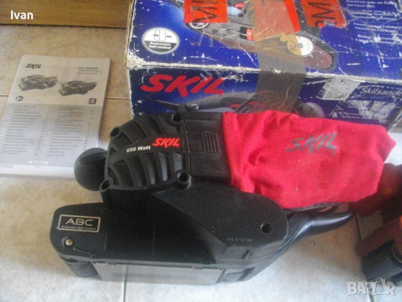ОПИСАНИЕ на лентов шлайф СКИЛ - 650 вата в кашон, производство - КНР. Цена 139 лв.НАЛИЧЕН. Професионален лентов шлайф, с АВС контрол на скоростта, модел на Скил от 2014 г. Марка и модел на машината-Skil 1210. Производство-Китай 2014 г. Машината е почти нова, ползвана съвсем малко, в отлично визуално и техническо състояние. Работи много добре-силно, мощно, бързо и ефективно при работа. Мощност на мотора-650 вата, скорост на лентата- 300 метра в минута. За шкуркови ленти размер стандартен-76х457мм. Функция автоматична регулация на скоростта-АВС.Голям масивен конектор на отпадъчен прах, поемащ до 90 процента отпадъчната прах. Налична е оригиналната платова торба на конектора, с фабричното лого на марката.Предната и задна дръжки на машината са с удобни нехлъзгащи се гумени покрития.Клик-клик система за бърза смяна на шкурковата лента.Налична е оригиналната книжка с указания, на небългарски езици. Тегло на машината-2,8 кг, с кутията-3,0 кг. Към машината има 1 бр. шкурка за проба в офис Еконт.Комплекта е прибран в оригиналната си картонена фабрична опаковка.Цената е 99 лв, и е твърда и крайна. Към януари 2020 г. в магазинната мрежа в БГ, цената на бройка от модела нова машина струва около 170 лв.