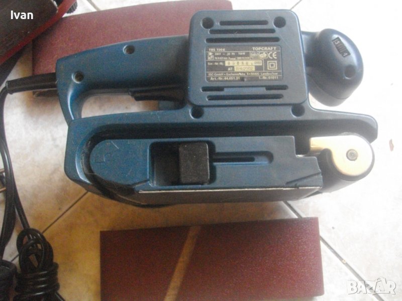 лентов шлайф Топ Крафт НАЛИЧЕН. С РЕГУЛАЦИЯ СКОРОСТ. Цена - 179 лв. Почти нов 720 ватов лентов шлайф,професионален модел на Топ Крафт,с регулация на скоростта.Немско оригинално производство,упоменато на маркировките. Марка и модел-Top Craft TBS 720E.Машината е почти нова,с много запазен външен вид и отлично техническо състояние.работи много добре-силно,мощно,бързо и ефикасно.Мощност на мотора-720 вата,скорост на лентата-200м/минута.За шлифовъчни ленти размер стандартен 76х457мм.Брой степени регулация скорост-6.Автостоп на спусъка-шпиндел. Машината е без шкуркова лента. Моля, за пробата в офис Еконт - носете си шкурка, от упоменатият размер.