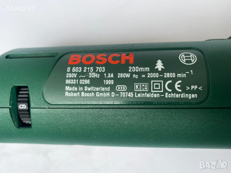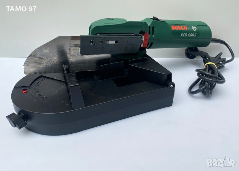 первази, дъски, ъгли и други с регулатор на оборотите Бош, комплекта е в перфектно визуално и техническо състояние без следи от употреба, оригинално швейцарско производство и внос от Франция. Комплекта включва трион, стойка, 2бр. използвани ножове Bosch FS180AT, Bosch FS200ABU и оригинален куфар.Марка и модел: Bosch PFS 280 E